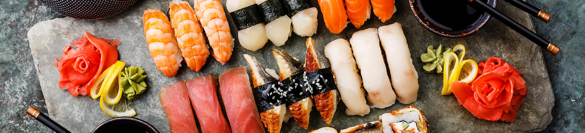 frischer Lachs, Thunfisch, Jakobsmuscheln, gekochte Garnelen, knusprige Garnelen im Tempuramantel